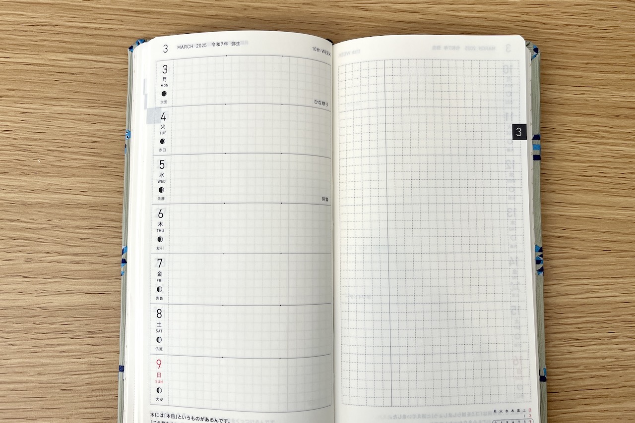 ほぼ日手帳weeksは週間レフトタイプの手帳で、写真のように左側に1週間の予定を、右側にメモを書くスペースがあります。