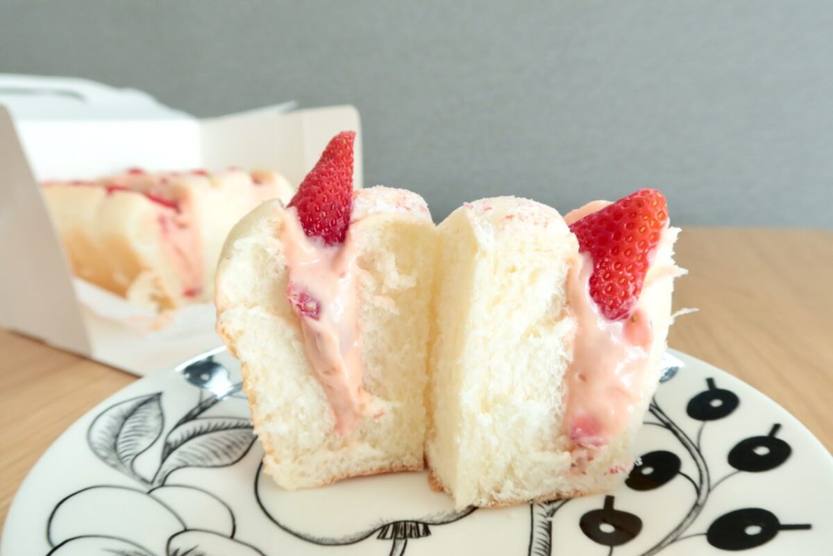 パンを切った断面です。ちなみにいちごはパンの上に乗っているだけではなく、クリームの中にもいちごが入っています。