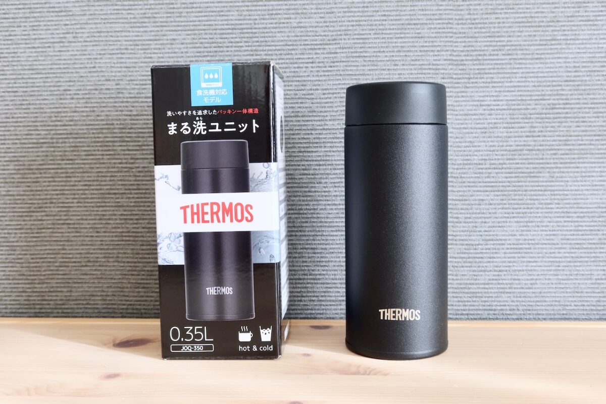 こちらが2022年8月に発売された食洗機対応&サーモス初のパッキン一体構造を採用した水筒「真空断熱ケータイマグ(JOQ-350)」です。
