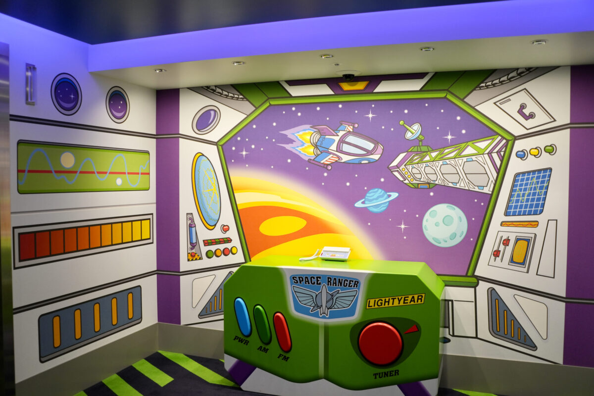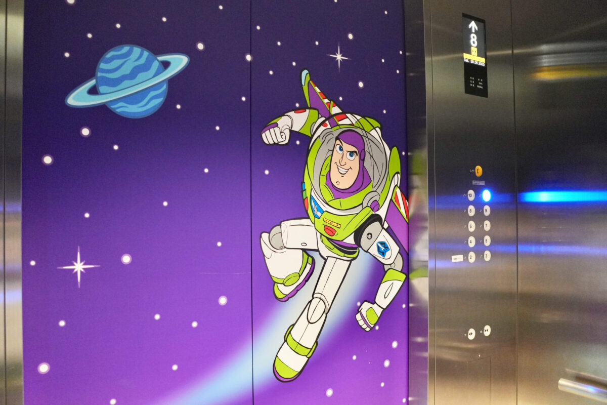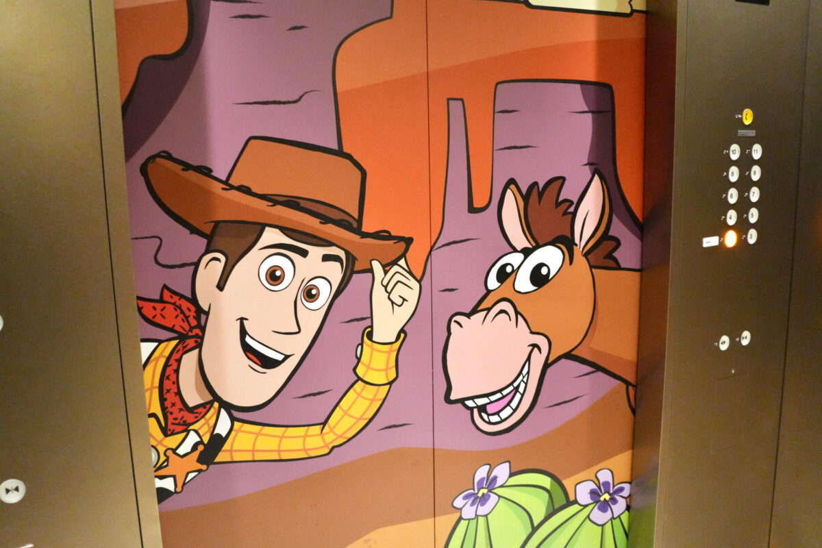 まずはエレベーターの内装がとてもかわいく、ウッディとブルズアイが描かれていました。