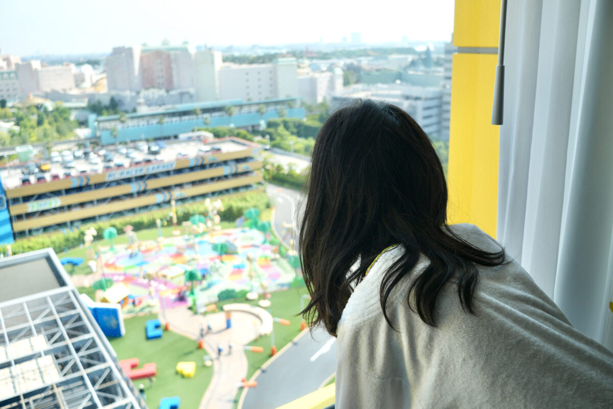 ホテルの中庭の他にもリゾートラインやディズニーシーが見えるのでけっこう良い景色です。