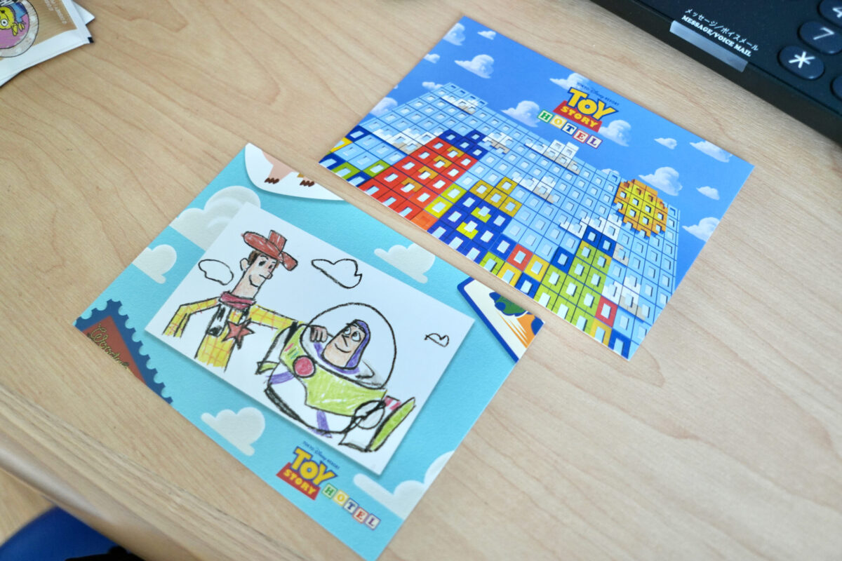 デスクの上に壁に貼られていたウッディとバズのイラストのポストカードが置かれていました。(娘が持ち帰って大事に保管しています)